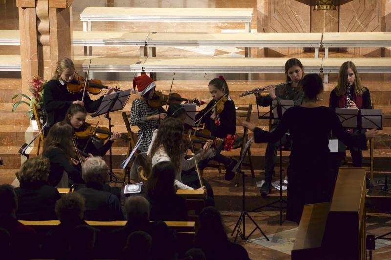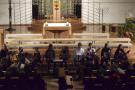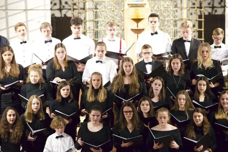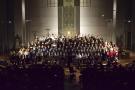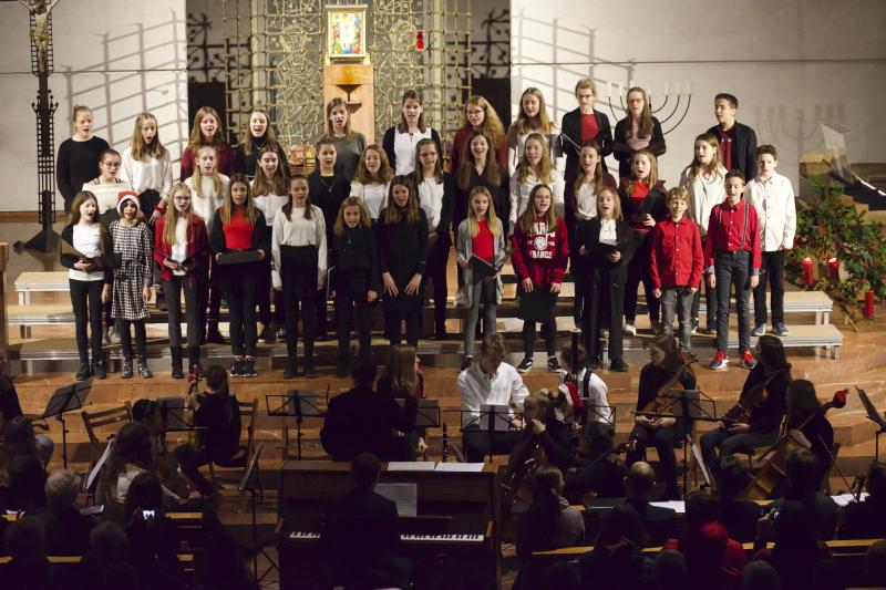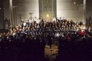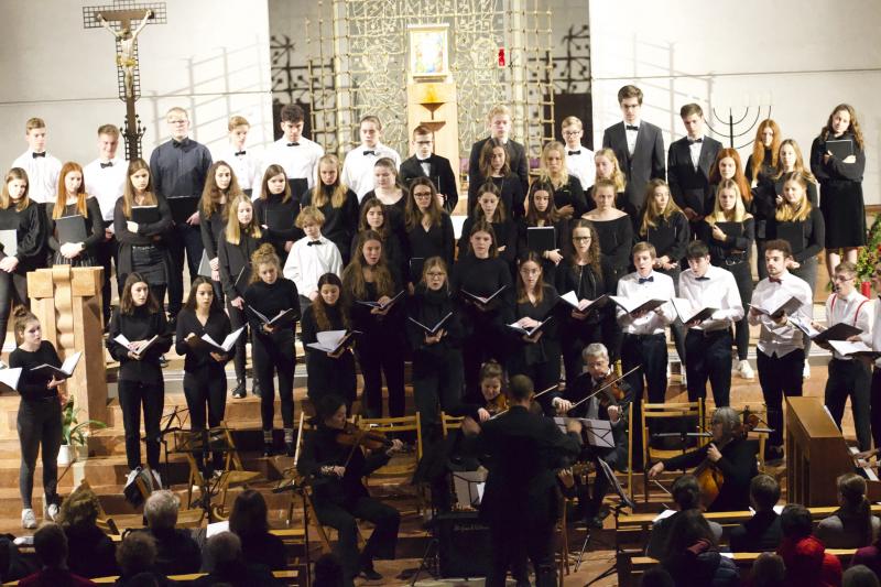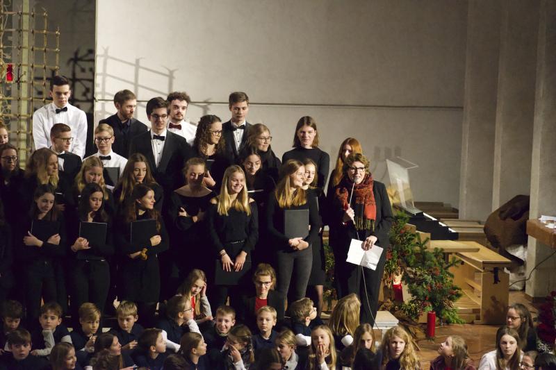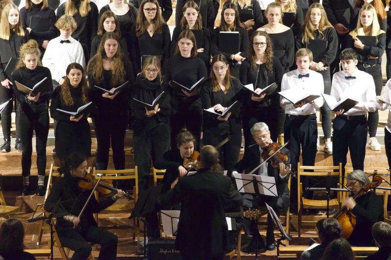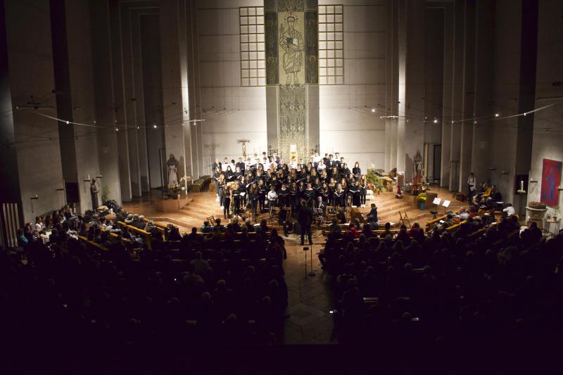 Den Altarraum füllten alle Chor- und Orchester-Ensembles des Gymnasiums: Die Gesangsklassen (6a und 6b donnertags/5a, 5b und Mittelstufenchor freitags), der Kammerchor, der Oberstufenchor, das Olag*-Ensemble (Lehrer-Orchester plus special guests), das Orchester und einige ehemalige Schülerinnen und Schüler sowie Lehrer.