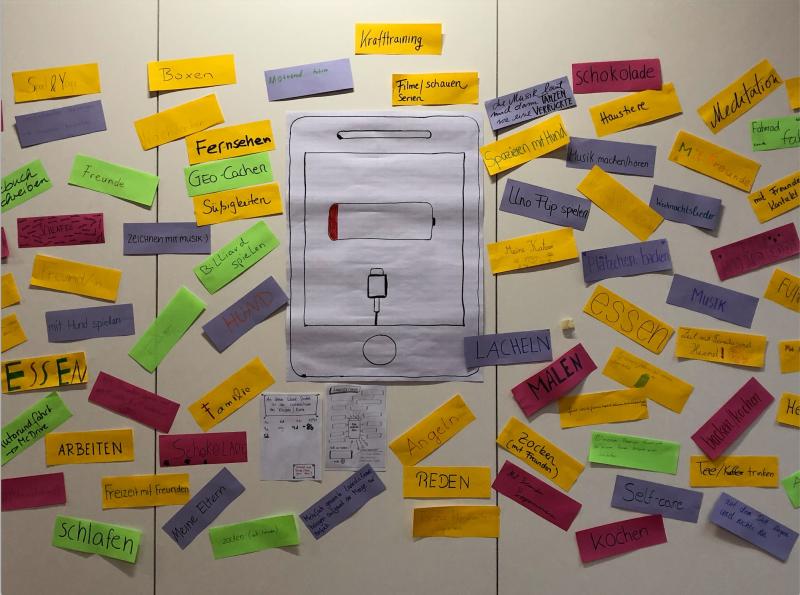 Die Antworten haben die Klassen bzw. Kurse zunächst in ihrer Runde besprochen und dann in einer großen Collage im Foyer gesammelt. Hier können sich unsere Schüler*innen Ideen holen, wenn alle erprobten Ladestationen nicht funktionieren. Da zurzeit leider niemand direkt im Foyer nachsehen kann, finden Sie hier ein paar Beispiele.