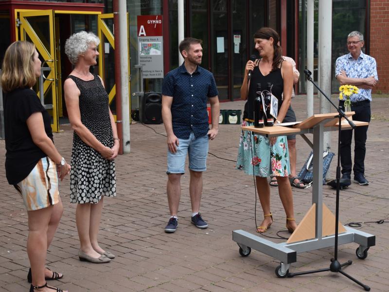 Sehr engagiert erlebte das Kollegium auch die Arbeit der beiden Schulsozialarbeiterinnen. Christiane Sternjacob war seit 2014 an unserer Schule tätig. Sie stand den Klassen- und Kursleiterin immer mit Rat und Tat zur Seite und bereitete kleine Schulungsprogramme zum Umgang mit kooperativen Spielen für die Lehrer*innen vor. Im letzten Jahr wurde sie dabei tatkräftig von Mira Kopp unterstützt. Beide Schulsozialarbeiterinnen hatten bei pädagogischen Problemen immer ein offenes Ohr und unterstützten viele Schüler*innen in Einzelgesprächen. In Zukunft werden sie sich neuen Aufgaben außerhalb des Gymnos widmen.