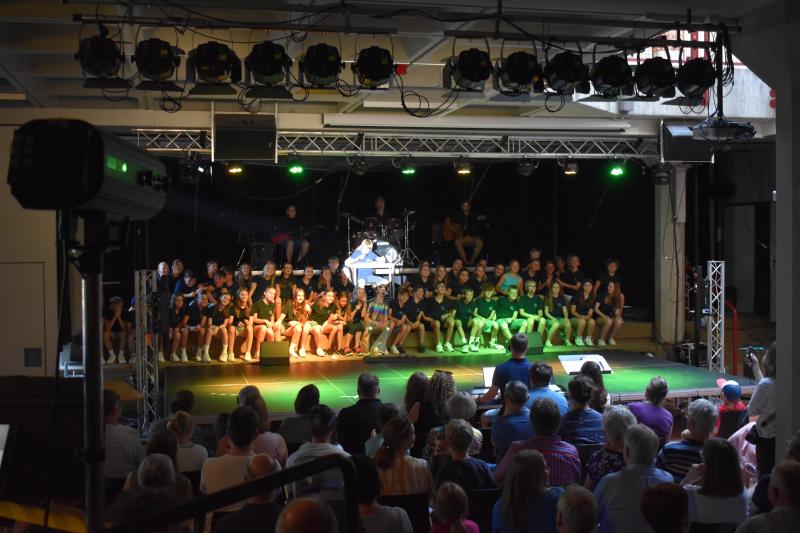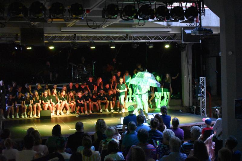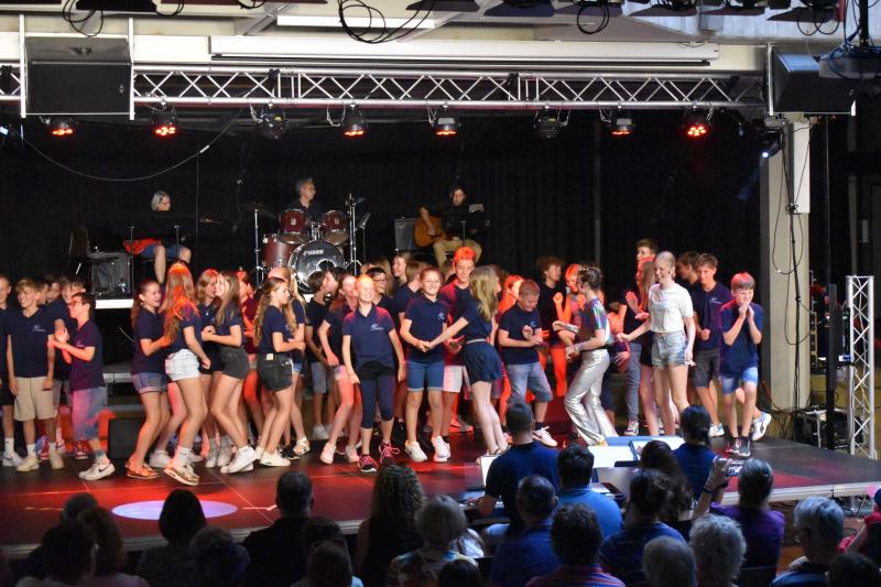 Die von verschiedenen Schauspieler:innen aus den Klassen souverän und versiert gespielte Handlung wurde mit bekannten Songs und Liedern verschiedener Stilrichtungen untermalt und kommentiert. Neben den zahlreichen Gesangssoli konnten die Klassen 6a und 6b im gemeinsamen Chor aus 60 Schüler:innen überzeugen und boten dem Publikum mit einem klanglich ausgewogenem und intonationssicherem dreistimmigen Gesang eine stimmungsvolle Show. Der große Erfolg des Musicals zeigte sich am Ende in einem langen Beifall.