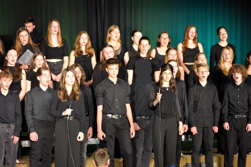 Ein weiterer Ohrenschmaus waren die Solisten. Aus dem Sopran sangen Amy Hotz und Tea Ostojic, aus dem Alt Hannah Ferber, Klara Hofmann, Luna Afshar und Smilla Falcone und aus dem Bass Cassian Zgraja solistisch. Ein zusätzliches Quartett aus Amy Hotz (Sopran), Lotta Yilmaz (Alt), Miro Yilmaz (Tenor) und Cassian Zgraja (Bass) begeisterte die Konzertbesucher in ihrem vierstimmigen Gesang ebenfalls. Auch die Band mit Liv Thatenhorst am Schlagzeug und Cajon sowie Yann-Elias Gaebelein an der Gitarre sorgten für einen authentischen Begleitsound.