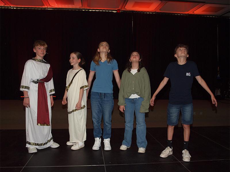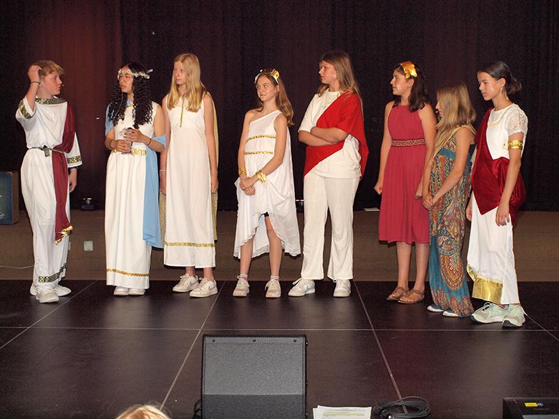 Die Eltern und die weiteren Gäste freuten sich über den badenden Poseidon, der sich mit Frau Großastroth stritt und über Zeus, der mit dem Direktor Machtkämpfe austrug. Die Zuschauer litten mit Hermes und Dionysos, als sich die Lehrer Frau Ibata, Herr Zoder und Herr Bolender (erfüllt vom Geist der Schicksalsgöttinen) als Orakel nicht auf einen Wettkampfsieger einigen konnten. Alle schmunzelten über Max als Herr Hartung, der Athene für ihre Mathekünste lobte.