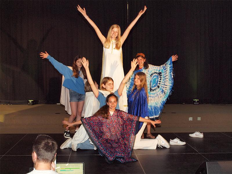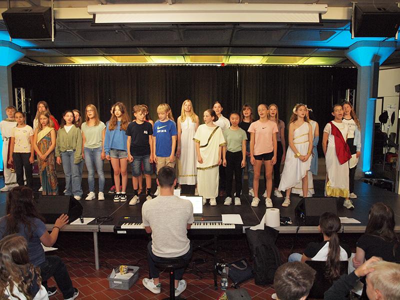 Auf die Textproduktion folgte das Einstudieren der ein- bis dreistimmigen Lieder und der szenischen Umsetzung. Auch wenn an manchen Tagen der Sättigungsgrad bereits erreicht schien, so kämpfte man sich doch durch und wurde durch eine grandiose Abendaufführung dafür belohnt.