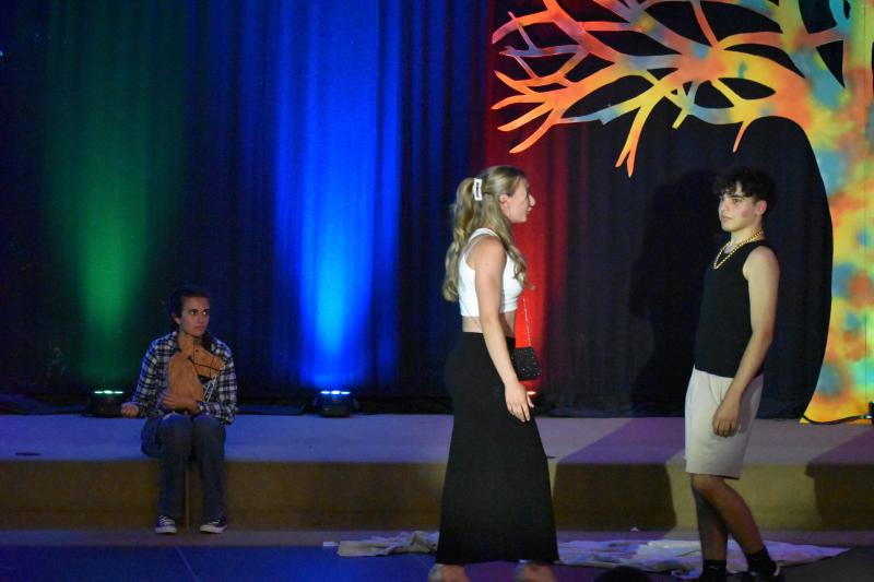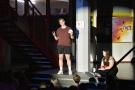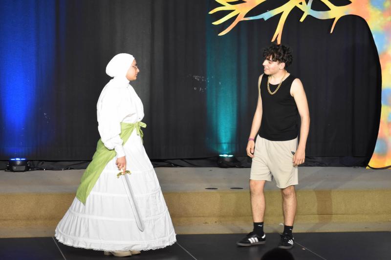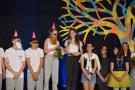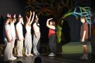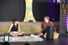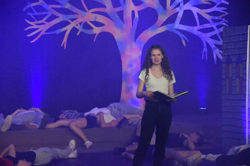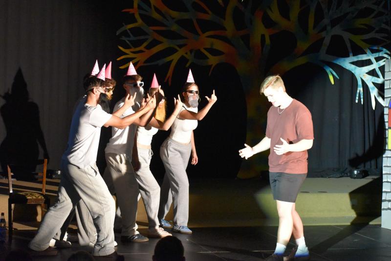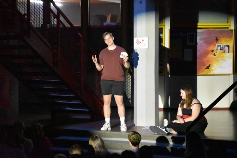 Bereits am Anfang der Aufführung von „Das Schlummerland“ am Dienstag, den 25. Juni, merkt man, hier bei der Präsentation des DS-Kurses der Jahrgangsstufe 12 unter der Leitung von Joachim Bayer im gut besetzen Foyer des GYMNO ist nicht alles so, wie bei den Gebrüdern Grimm geplant: die 7 Zwerge sind nur zu sechst, Schneewittchen hat keine Lust mehr auf ihren Prinzen und wünscht sich eigentlich viel mehr eine Prinzessin, der Märchenwald wurde von einer Hippie-Kommune gestaltet und Rapunzel stellt sich dementsprechend als freie Liebe Lebende dar, der Wolf trinkt Coffee to go und philosophiert über Willensfreiheit…