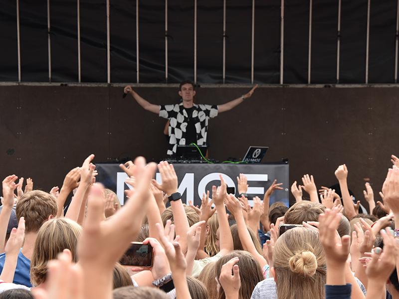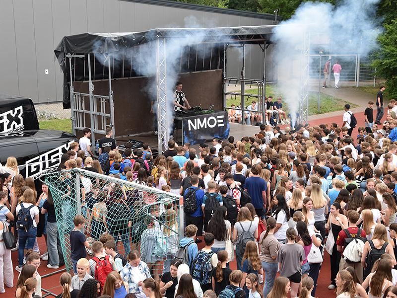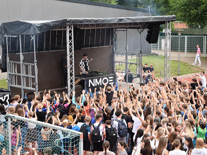 Da staunten die fast 1700 Schülerinnen und Schüler des Gymnasiums Nieder-Olm nicht schlecht – kurz vor Zeugnisausgabe gab es auf dem Schulhof ein 45-minütiges Gratiskonzert mit DJ NMOE.