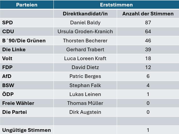 FDP, AfD und BSW scheitern dagegen an der 5%-Hürde. Das Direktmandat für den Wahlkreis Mainz-Bingen holt sich mit deutlichen Vorsprung Daniel Baldy von der SPD.