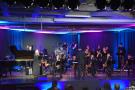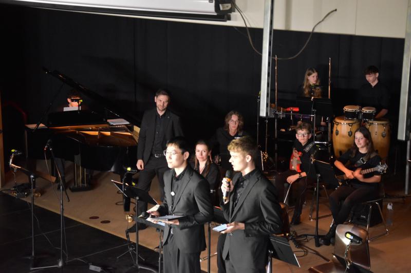 Die Abiturienten Kai Qin und Henrik Büscher führten kurzweilig durch den Abend und versorgten die Gäste mit den wichtigsten Informationen zu den Stücken, die die 17 Musikerinnen und Musiker aus den Klassenstufen 8-13 mit ihrem Bandleader Marcel Rudszeck einstudiert hatten.